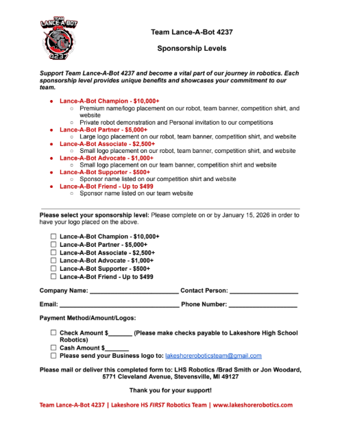 We always need more sponsors for our ever-growing team. If you would like to sponsor us, or know someone else who would like to sponsor, click the PDF to print it out! We welcome everyone, so any help is absolutely welcome! Thank you for supporting Lakeshore High School Robotics! You can also find this PDF at the top of our sponsors page. We appreciate all your help!